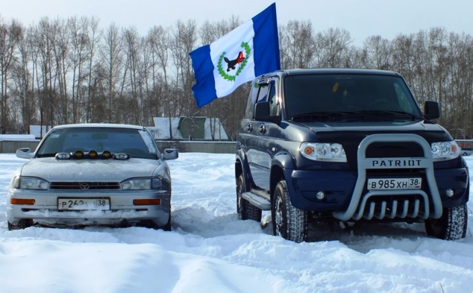 Cамое неожиданное случилось потом. Когда поехали домой, решили найти поле и покататься по чистому снегу, к "Патриоту" присоединилось трое Субару форестеров. Но это еще не всё! По дороге домой у иркутской Камри Снегоджипа сорвало капот. Другие авто чудом не задело! Смотрите видео: