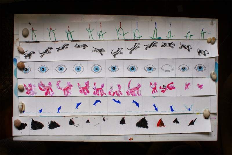 Тем, кто не очень любит рисовать, или тем, кто пасует перед трудной задачей нарисовать 11 картинок, можно предложить начать с наклеек - например взять 11 кружочков и сделать мультфильм о прыгающем мячике. Еще один способ упростить себе жизнь - нарисовать шаблонного персонажа, вырезать, а затем в каждом кадре частично его обводить. Рисовать лучше всего яркими фломастерами или мелками, чтобы рисунок легко считывался глазом. Ну и несколько наших мультфильмов для того, чтобы у вас зачесались руки))
