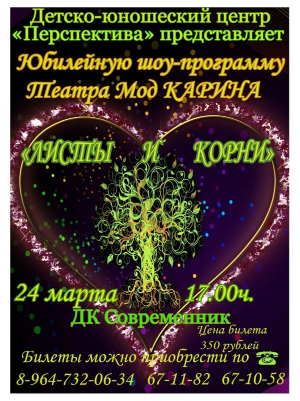 Народный коллектив Театр мод «Карина» отмечает 30-летие и свою юбилейную шоу-программу «Листы и корни» народный коллектив традиционно представит на сцене ДК «Современник» 24 марта в 17:00. Коллектив и педагоги приглашают своих добрых друзей и поклонников таланта в атмосферу любви и красоты, в которую окунется каждый, кто придет на представление!