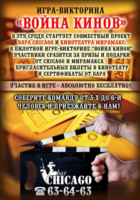в пилотной игре-викторине "Война кинов" участники сразятся за призы и подарки от CHICAGO и МИРАМАКСА - пригласительные билеты в кинотеатр и сертификаты от бара.