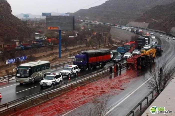 9 апреля в 28 километрах от китайской провинции Ганьсу произошла крупная авария грузовика, который перевозил не одну тонну....... соуса чили. Водитель самого грузовика не пострадал, но некоторых водителей легковушек, проезжавших мимо, с травмами доставили в больницу. Местные жители сразу же ринулись на халяву и нагребли соуса на несколько лет вперед.