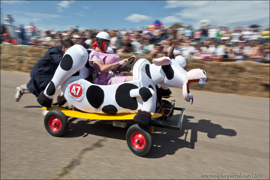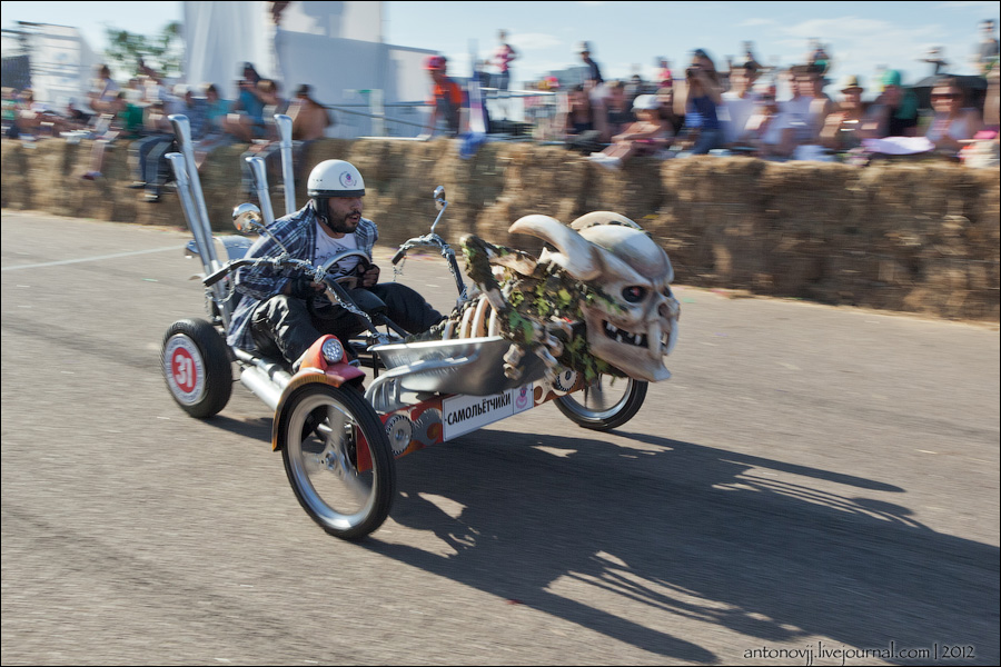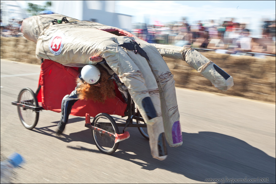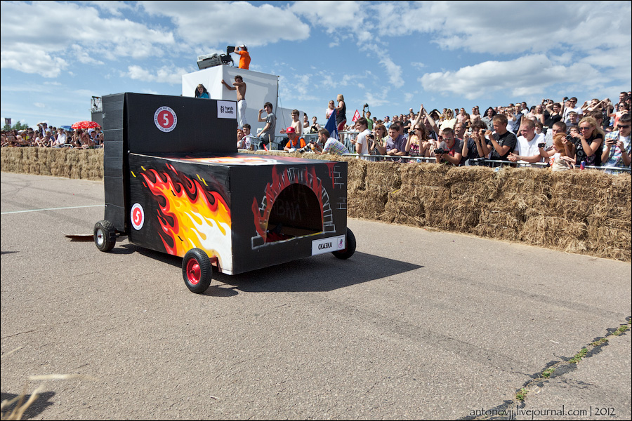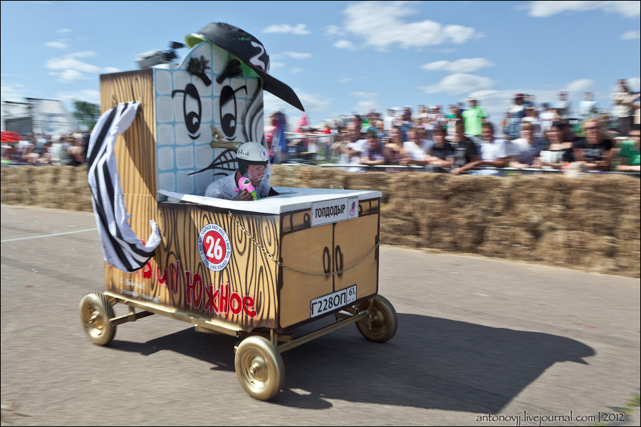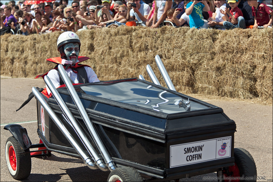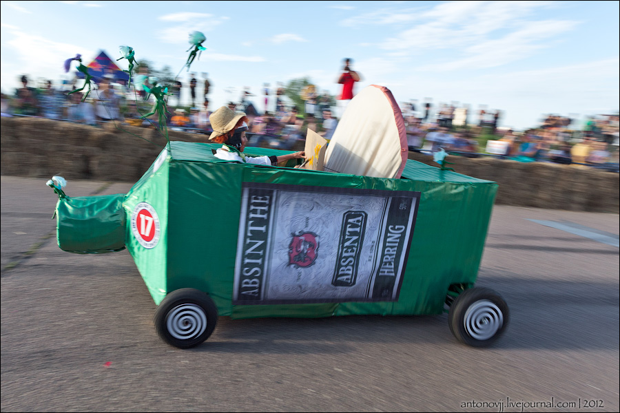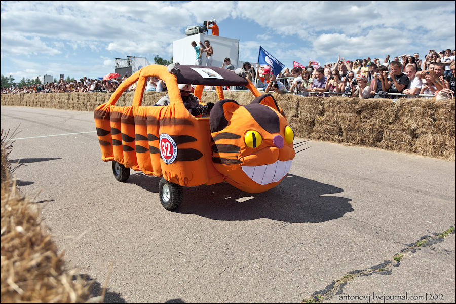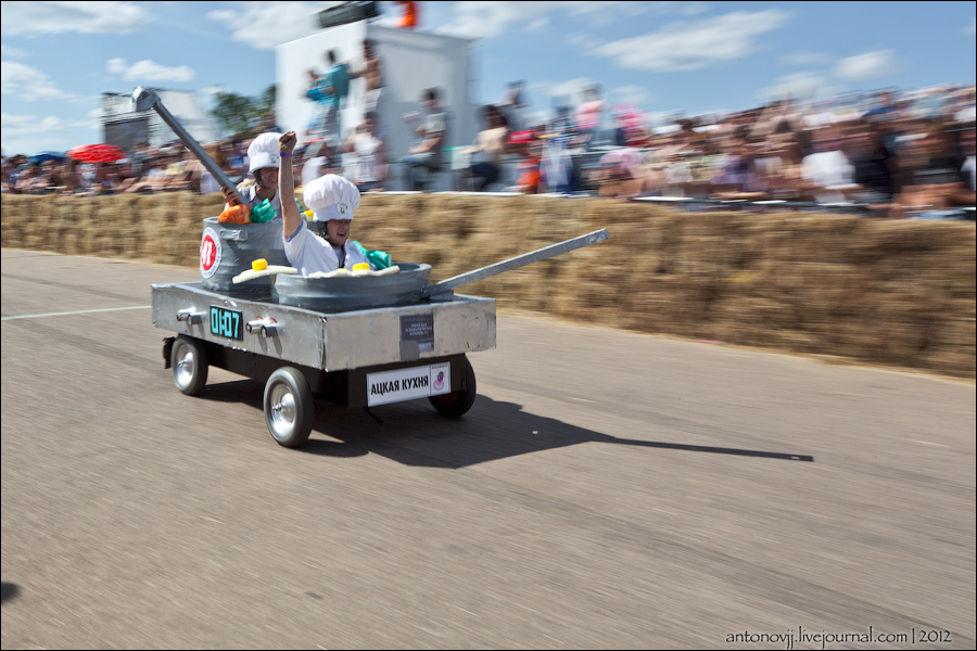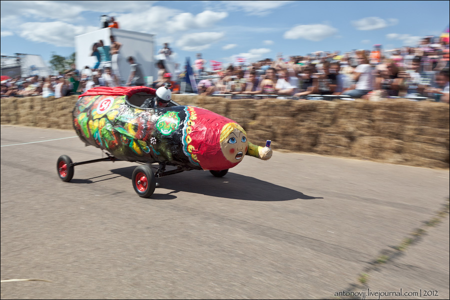 Гонки на тарантасах, это очередное массовое мероприятие от всем известного энегретика Red Bull. Нос, Печень, Яйца Вассермана, Кузькина мать, Гопдодыр, Бредни Музыкантов, Ацкая кухня, Старые Херцы на Красном перце - это только названия некоторых команд, состязавшихся в скорости и креативности в Москве. Всего было 56 участников из разных городов России.