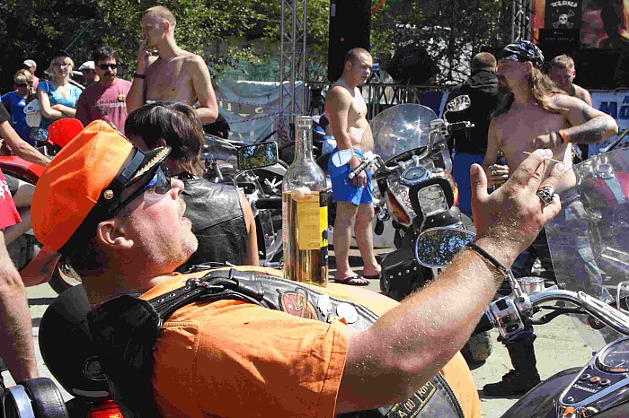 Видимо вы просто не умеете отдыхать, пьяные люди есть только на последней фотографии, и то не байкеры, а просто мужчины проходили мимо и попросили их сфотографировать с байкером, фото не особо удачное, но какое уж есть, на остальных фото пьяных нет, есть люди которые отдыхают, дурачатся и корчат рожицы))). Сильно пьяных небыло, да выпивали, но всё в рамках приличия. Вот ещё несколько фото.