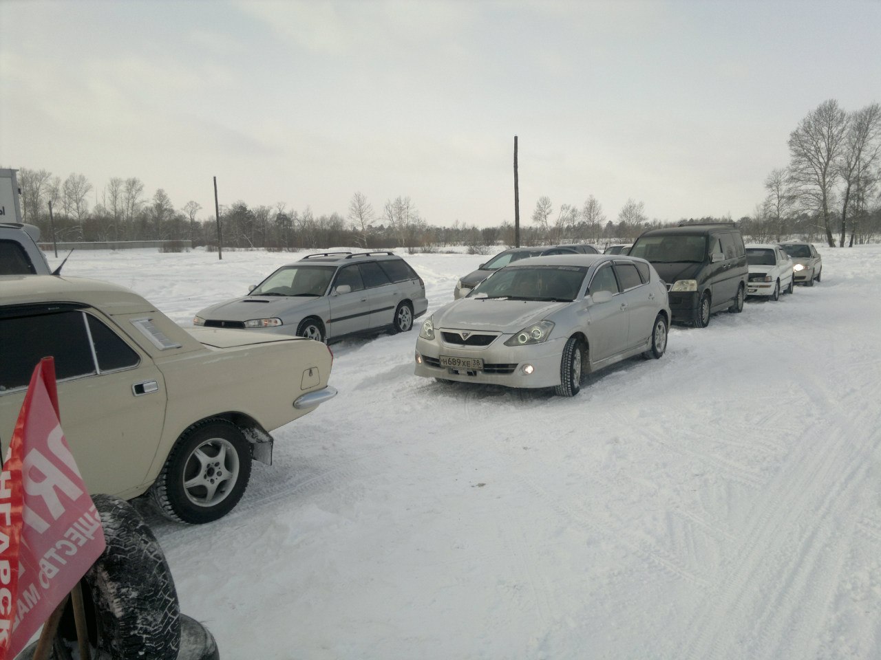 А теперь о встрече. Все начиналось очень просто. Ангарчане, посмотрев как собираются иркутяне на покатушки, решили организовать свою встречу в пойме реки Китой. Иркутян пригласили в гости и приготовили гоночную трассу. В Шаронах (Мегет) 9 машин из Иркутска организовали позитивную колонну, во главе которой пустили машину с флагом.