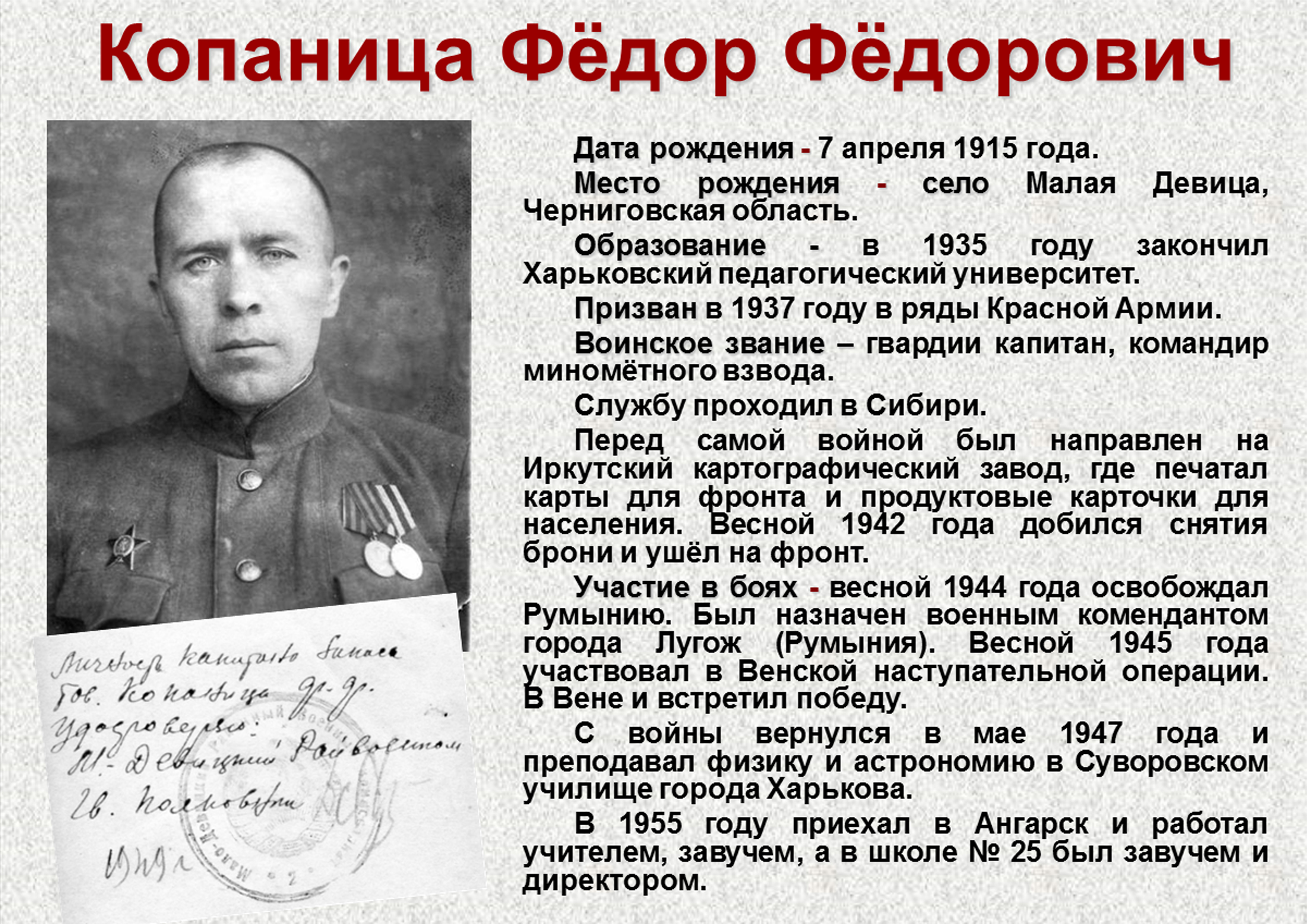 Для всех нас – внуков и правнуков он навсегда останется примером. Я горжусь своим прадедом и благодарю за жизнь и мир. Спасибо тебе, солдат!