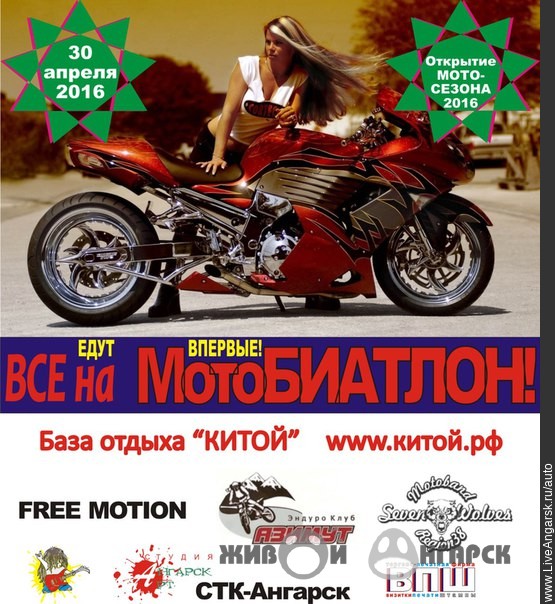 30 апреля состоится Совместное Общегородское Открытие Мотосезона в городах Усолье-Сибирское и Ангарске. Общий сбор и старт мотоколонне будет дан в г.Усолье-Сибирское. Далее колонна направляется в г.Ангарск, куда дополнительно подтянутся мотоциклисты со стороны Иркутска. Организованным движением в сопровождении ГИБДД мотоколонна двинется на место проведения Праздника на базу отдыха «Китой». Ожидаемое количество гостей 500 человек.