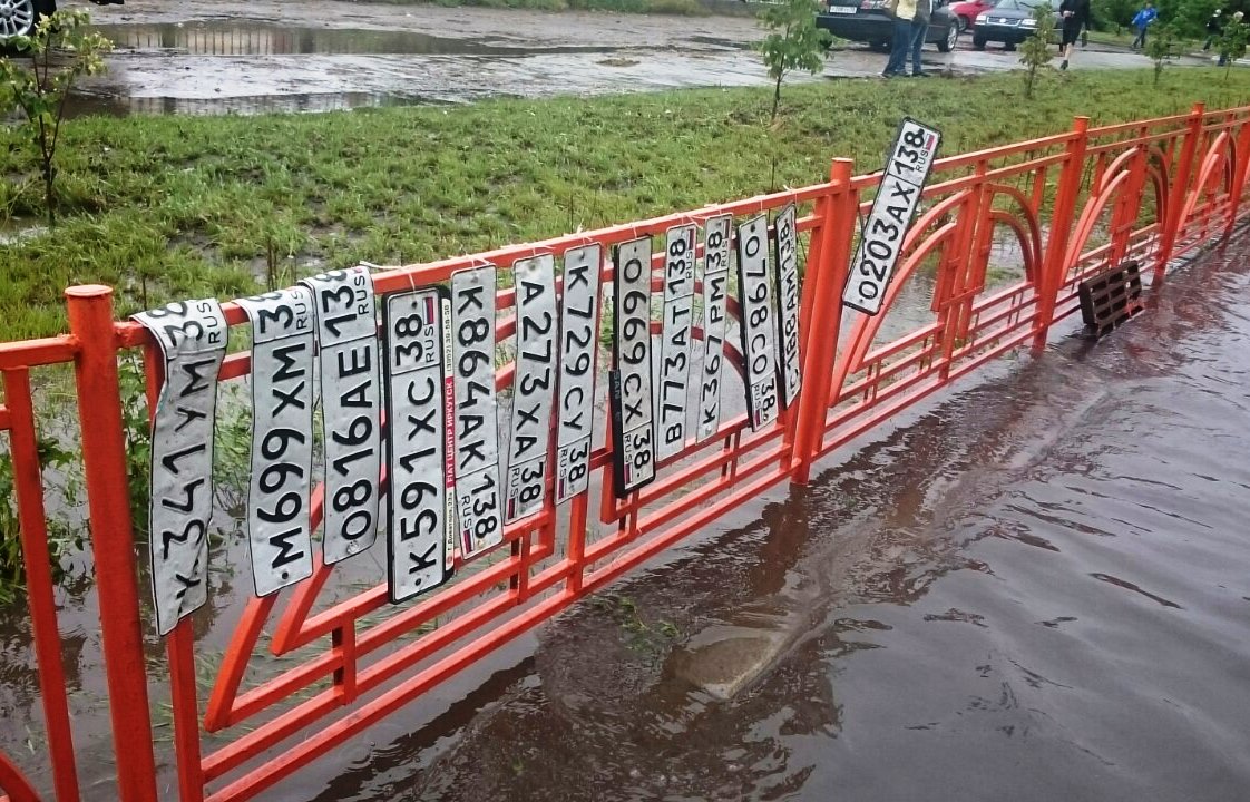 После субботнего ливня, 9 июля, многие водители обнаружили, что потеряли номер. Но, как говорится, был бы спрос, будет и предложение. Во втором Иркутске группа предприимчивых парней решили помочь водителям, вылавливая в луже потерянные госномера и развешивая их на заборе. Очевидцы сообщают, что каждый выловленный номер стоит от 50 рублей, в зависимости от "значимости".