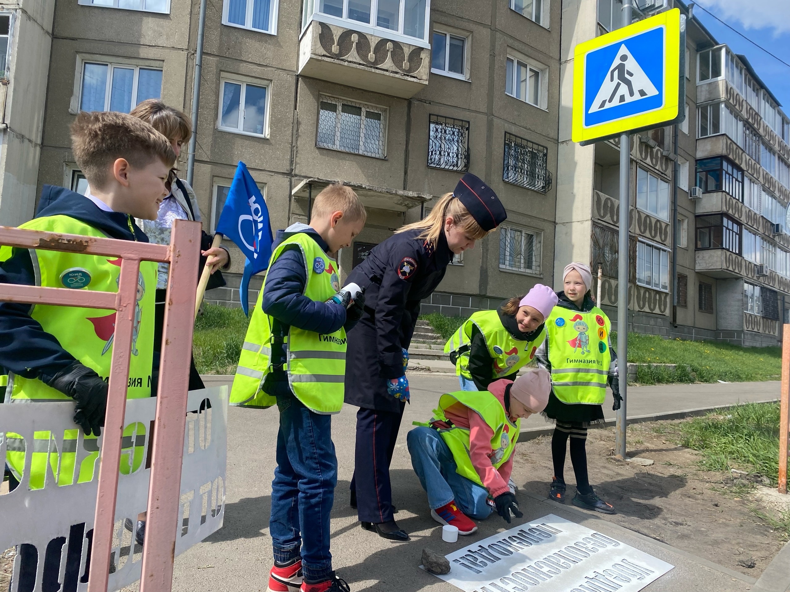 В Ангарске госавтоинспекторы, школьники и общественники разместили на тротуаре напоминания для пешеходов