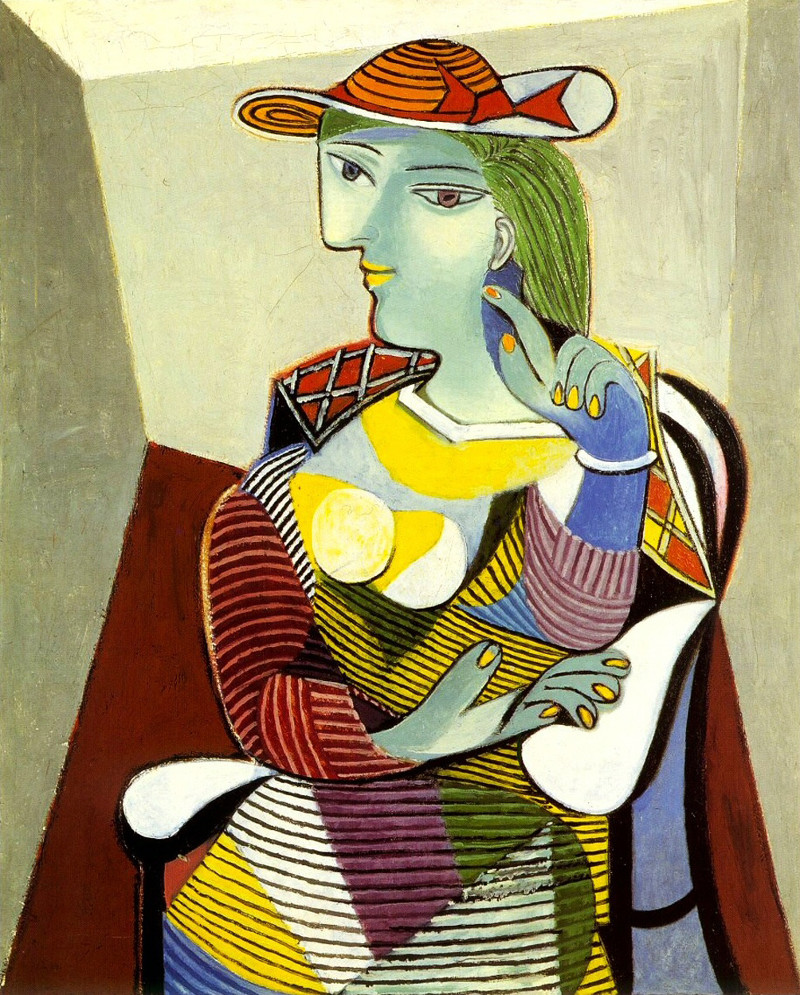 Не всем везет так, как Джейн Бёрден. Марии-Терезе было семнадцать, она была блондинка и вопиюще хороша собой. В нее влюбился женатый художник, стал ее активно рисовать, (хотя лично мы бы сбежали после первого же вот такого портрета). Именно эта картинка – одна из многих, но если вы видите тетеньку-камбалу с глазами на щеке и двадцатью пальцами, торчащими прямо из подмышки, и всё это в веселеньких тонах, то в девяти случаях их десяти – это она, бедняжка.