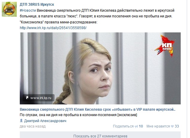 Как сообщает «Комсомольская правда», виновница смертельного ДТП Юлия Киселева отбывает наказание не в колонии-поселении – как ей назначено приговором суда, – а в VIP палате иркутской больницы.