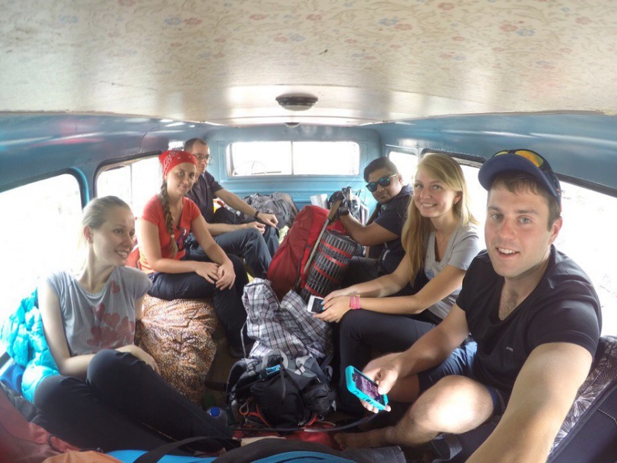 Прдъехал наш транспорт! Это УАЗ, 1988 года светло, то ли синего, то ли серого цвета, я бы назвал его джинсовым. За рулем Сергей, мужчина с седой бородой и закатанной по рукава плотной темно-серой рубахе. С ним наши гиды - Олеся и Саша. Они оба с Украины. В нашей группе, Саша главный,он, так сказать, руководитель группы.