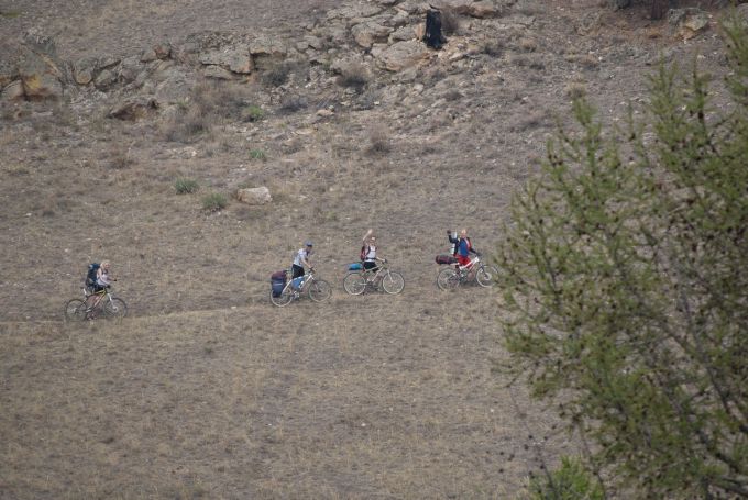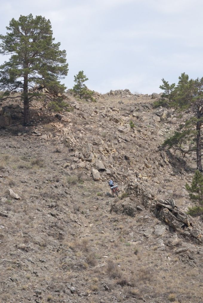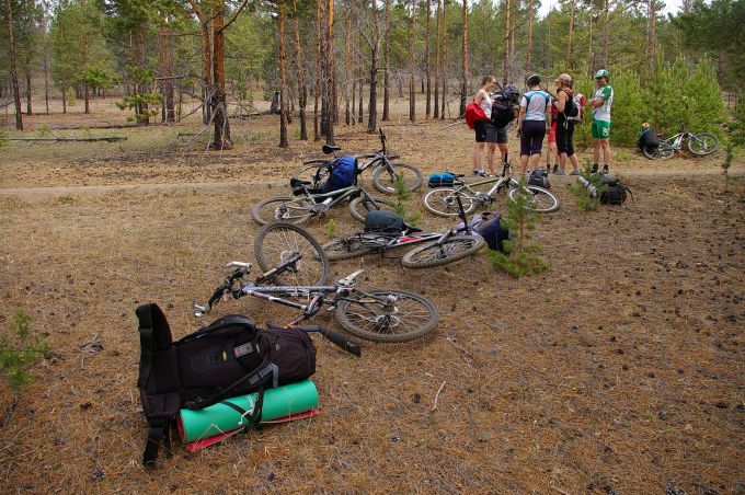 А вот туда надо спуститься. Люди в палатках внизу вытягивали шеи, явно не ожидая увидеть скатывающихся крутого лесного склона велосипедистов.