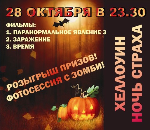 В ночь с 28 на 29 октября кинотеатр "Мир@max" приглашает на "НОЧЬ СТРАХА. ХЕЛЛОУИН". Начало в 23.30.