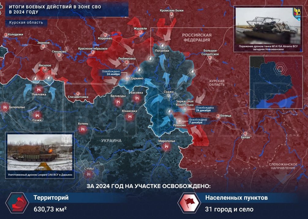 В декабре ВС РФ постепенно выдавливали части ВСУ из Курской области, которые пытались остановить наше наступление с помощью контратак и даже захватили ряд населенных пунктов, но в течение нескольких дней ВСУ их снова потеряли.
