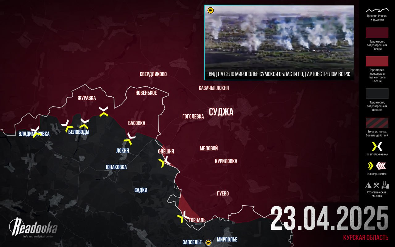Российские войска к концу апреля вытеснили ВСУ из Курской области и захватили Горналь (к юго-западу от Суджи), последний удерживаемый Украиной населённый пункт в области.