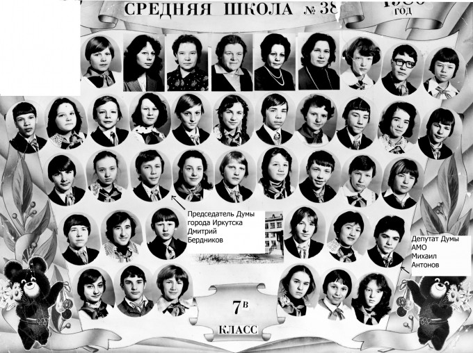 С 1973 по 1981 год в средней школе №38, которая находится на улице Крупской, в одном классе учились два будущих муниципальных депутата Михаил Антонов и Дмитрий Бердников. Через 33 года, 14 сентября Михаил Антонов был избран депутатом Думы Ангарского муниципального образования. В то же время депутатом города Иркутска стал Дмитрий Бердников, который позднее был избран председателем Думы города Иркутска.![]()