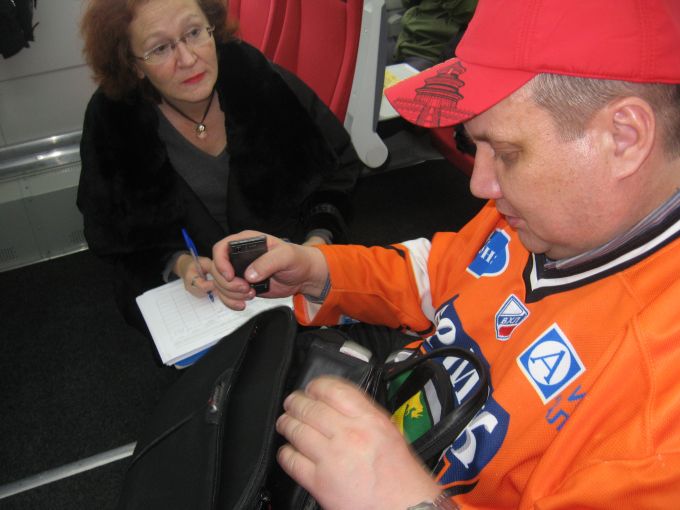 Невероятно приятно удивило гостеприимство администрации стадиона. Начальник службы безопасности сам предложил и помогал подложить коробки под барабаны, чтобы нам было удобней стучать! Это вам не Красноярск! Но, думаю, там уже поняли свою ошибку,и той ситуации больше не повторится. Почему? Да просто наша инициатива, наш вездесущий и преданный ангарский оранжевый десант стал катализатором для местных болельщиков в желании проявить себя на нашем фоне! Что в Питере, что в Красе, болельщики пришли даже не чтобы поддержать свою команду — они пришли, во-первых,посмотреть на нас, не веря, что мы вообще приедем, а во-вторых, доказатьнам, что тоже любят свою команду и умеют болеть за свой хоккей! А мы только рады — ведь хоккей сближает, делает нашу жизнь веселей и разнообразней! Одна ангарчанка, живущая теперь в Санкт-Петербурге, пишет мне теперь в одноклассниках: «Эх... за СКА тут что ли болеть начать...Тоже теперь хочу ходить на хоккей! Только куда-нить с фанатами - так прикольней!» А дома, кстати, на «Ермак» не ходила.