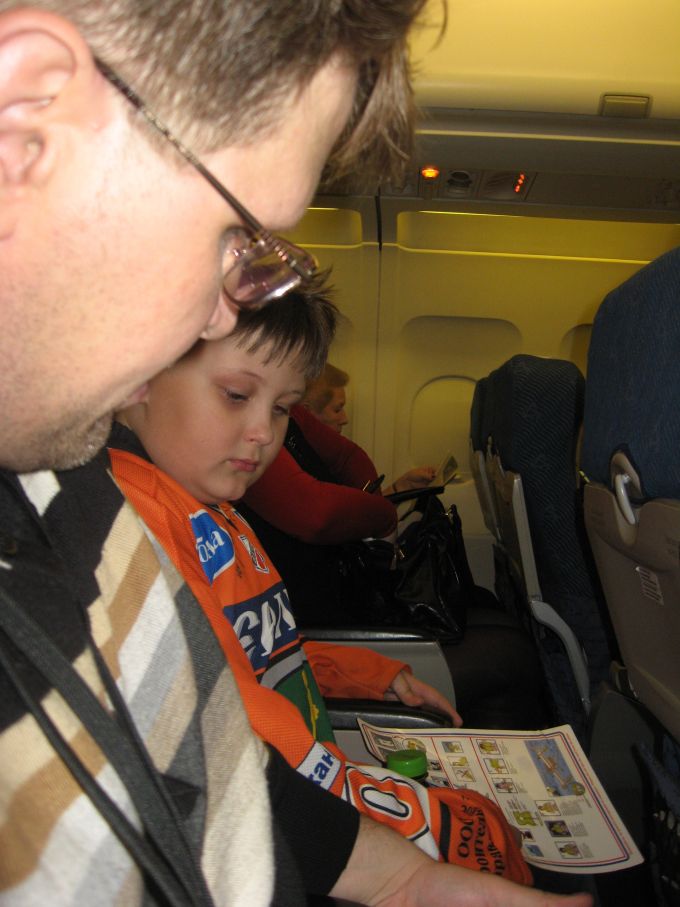 В самолёте малышня собирала автографы на новенькие майки у хоккеистов. Взрослые летели уставшими, я бы сказал - обессиленными, но довольными.