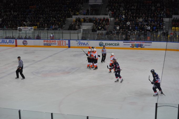 Объективно, в первом периоде, этот стадион зрителей нас порой перекрикивал. И не мудрено: начало матча прошло в каком-то сумбуре, много неточных передач «Ермака» во всех зонах, как средней, соперника, так и своей. Такая разорванная игра нашей команды привела к тому, что уже к 14 минуте первого периода мы горели 2:0! Первый гол забил Сёмин, и естественно, что стадион просто взорвался овациями! Но на какие-то 15-20 секунд, потом снова настало наше время – время оранжевого сектора. Во второй шайбе в ворота «Ермака» также поучаствовал знаменитый красноярский форвард – нас снова перекричали на полминуты, не больше. Затем все пошло под диктовку наших барабанов и кричалок! Мы верили в команду, мы знали, что ребята будут биться до конца – первый период не показатель! И уже к 17 минуте, с передачи Юшкова, Смирнов принес первую баночку в ворота земляков, вселив уверенность в наши сердца, что это не последняя наша радость в этом матче!