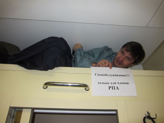 Ничего не понимаем. Как Грибанов это сделал, если сам уехал семичасовым поездом? Раздеваемся и замечаем, что на боковой багажной полке прячется наш коллега из Улан-Удэ. Это он нас так разыграл. Ржём. Значит едем всё-таки вшестером. На полтора купе. Всё ж веселее.