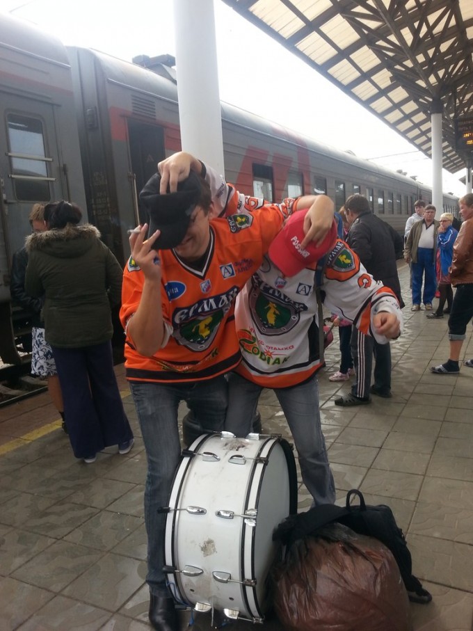 За два часа до матча, мы были уже на стадионе, куда в течение еще шестидесяти минут стянулись «свидетели оранжевые». И не только ангарчане – Иркутск тоже отметился своими представителями. В итоге нас набралось 18 человек. Вместе с Дашей. До Краса добирались по-разному: кто на машине, кто, также, как и мы – поездом. Был даже паренек, который приехал в Красноярск учиться, чтобы не париться с поездкой, когда «Сокол» принимает нашу команду, поэтому ждал нас уже там!