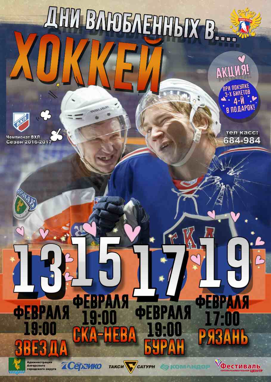 Что 13, 15, 17 и 19 февраля у влюбленных в хоккей жителей Ангарска праздничные дни - на льду "Ермака" развернется битва за место в плей-офф. И в связи с этим праздничный подарок - при покупке билетов на три матча серии, билеты на четвертый матч бесплатно. Ну это если прям вообще концептуально