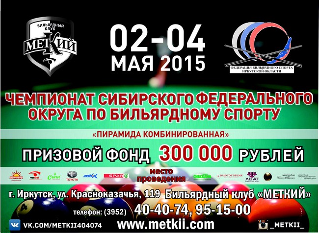 * Со 2 по 4 мая 2015 года в Иркутске пройдет всероссийский чемпионат Сибирского Федерального округа по бильярдному спорту в дисциплине «Пирамида комбинированная». Увидеть своими глазами игру «высокого бильярда» и самим стать его героями вы можете в течение трех дней соревнований. Чемпионат СФО пройдет в бильярдном клубе «Меткий» — одном из крупнейших бильярдных клубов Сибири. Начало в 9:30.