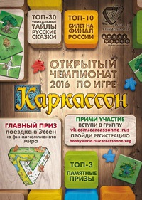 В Иркутске пройдёт отборочный чемпионат России по настольной игре «Каркассон». Место проведения: библиотека Молчанова-Сибирского. Каждому участнику чемпионата — памятные подарки! Лучшие игроки получат право в октябре побороться в Москве за титул Чемпиона России. Турнир организует хобби-центр «Знаем Играем». Справки по телефону: (3952) 72-37-53. Начало в 12:00.