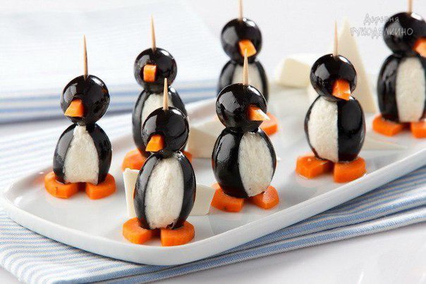 Из мягкого сыра типа моцареллы, оливок и моркови можно сделать забавных маленьких пингвинят, которые станут украшением праздничного стола. Фигурки закрепите зубочистками - и оригинальная закуска готова!
