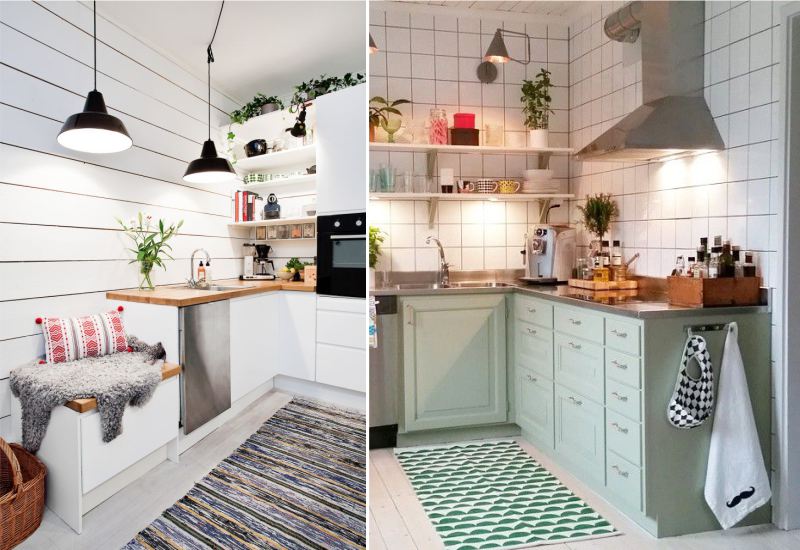 Совет: если площадь кухни позволяет, попробуйте использовать два ковра или даже составить целую композицию. Так, можно выбрать модели одной расцветки, но отличающиеся по форме и размерам. Расстелите их в разных участках: в рабочей и обеденной зонах, в центре, около окна.
