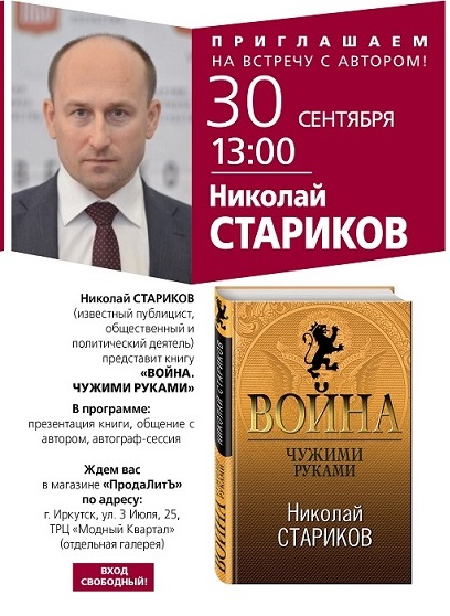 Встреча с известным публицистом, общественным и политический деятелем Николаем Стариковым пройдет в магазине «ПродаЛитЪ» по адресу: ул. 3 Июля, 25 (ТРЦ «Модный Квартал», отдельная галерея). Автор представит свою новую книгу «Война чужими руками», в которой исследуется история создания и использования «чужих рук» в мировой политике. В программе: презентация книги, общение с автором, автограф-сессия. Начало в 13:00, вход свободный.