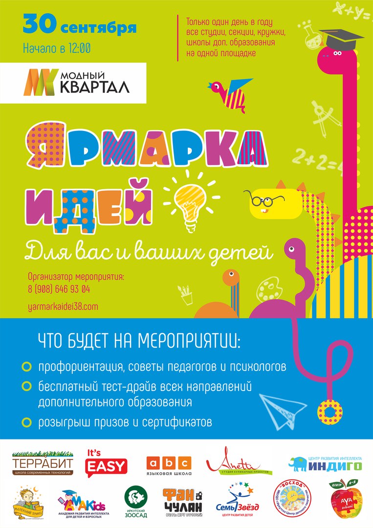 «Ярмарка идей» для взрослых и детей начнется в 12:00 в торгово-развлекательном комплексе «Модный квартал» (улица 3 Июля, 25). Ребятишки от 3 до 15 лет смогут попробовать свои силы и в изучении английского языка, ментальной арифметики, в робототехнике, танцах и других направлениях, выиграть призы и отлично провести время. А родители получат возможность узнать о новых образовательных направлениях и задать вопросы педагогам.