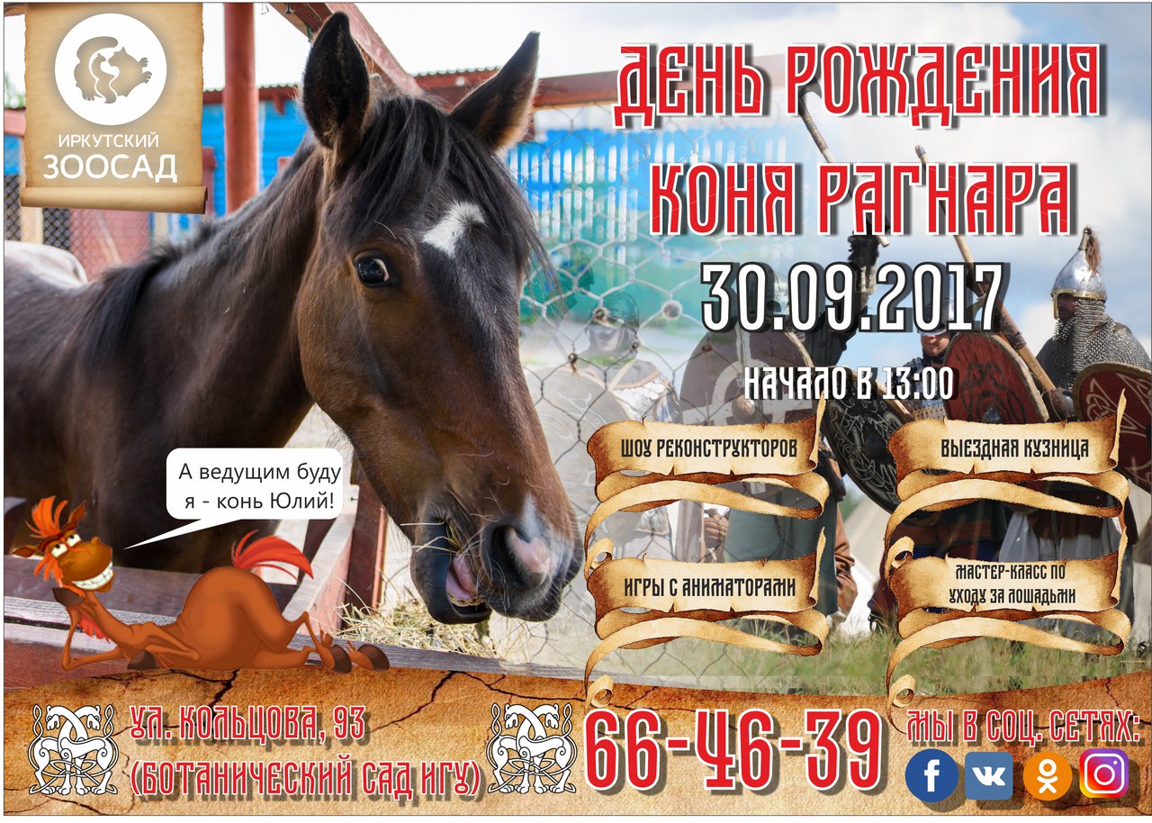 В Иркутском зоосаде пройдет праздник, посвященный дню рождения коня Рагнара. Скакун назван в честь легендарного предводителя викингов Рагнара Лодброка, поэтому празднование пройдёт в скандинавском стиле. Посетители смогут вживую увидеть эффектную схватку древних норманнов, а также сфотографироваться в боевом облачении этих суровых воинов. Мастер по дереву Дмитрий Орлов покажет, как изготовить прочный щит викинга. Для ребятишек проведут подвижные игры. Сам Рагнар примет участие в показательном уроке по уходу за лошадьми, подготовленном жокеем Ксенией Дмитровой. Начало праздника в 13:00 по адресу: ул. Кольцова, 93 (территория Ботанического сада ИГУ).