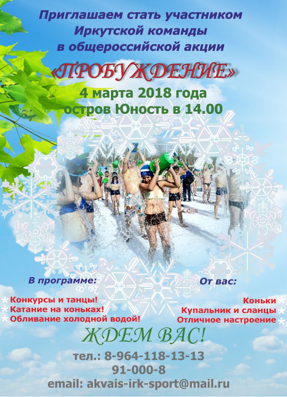 Акция по обливанию водой «Пробуждение» начнется в 14:00 на острове Юность, рядом с кафе «Остров». Приглашаются все желающие! Организаторы обещают интересную программу с соревнованиями по перетягиванию каната, массовой зарядкой, танцами и различными конкурсами. А после этого участники акции будут обливаться холодной водой, кидаться снежками и кататься на коньках в купальниках! С собой захватить: полотенце, купальные плавки или купальник, сланцы, коньки и отличное настроение. Тёплое помещение для переодевания будет предоставлено организаторами. Подробности акции по телефонам: 92-77-72, 91-00-08 и на сайте http://www.прибайкальцы.рф