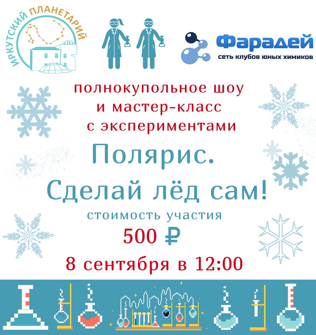 Иркутский планетарий и Клуб юных химиков "Фарадей" Иркутск приглашает детей в возрасте от 7 до 13 лет и их родителей на полнокупольное шоу "Полярис" и мастер-класс с экспериментами. Мы узнаем, почему на полюсах Земли холодно и ночь длится по полгода, а потом вместе сделаем искусственный снег, увидим снег, который не тает, заморозим лёд без холодильника. Забронировать места можно по телефону 79-79-09, добавочный 1.