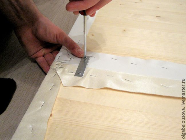 После строительным степлером, начиная с середины вертикальной стороны щита, убедившись, что искусственная кожа и поролон лежат ровно, нужно "прошить" стороны, чередуя одну с другой, не забывая натягивать материал, но не перетягивая.