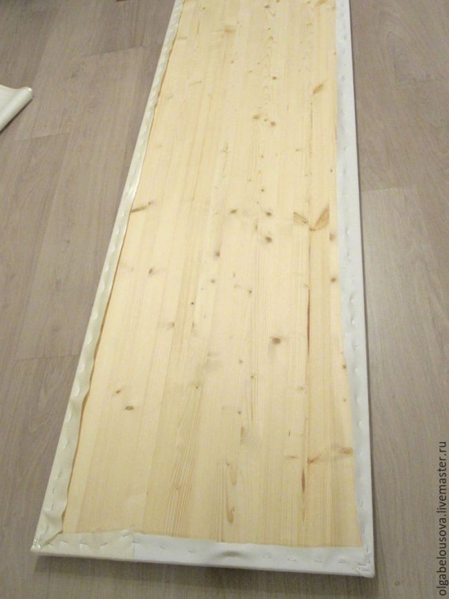 После того, как все составляющие нарезаны, нужно соединить все это воедино. Порядок сложения всех составляющих: искусственная кожа (изнаночной стороной вверх), затем поролон и сверху мебельный щит.