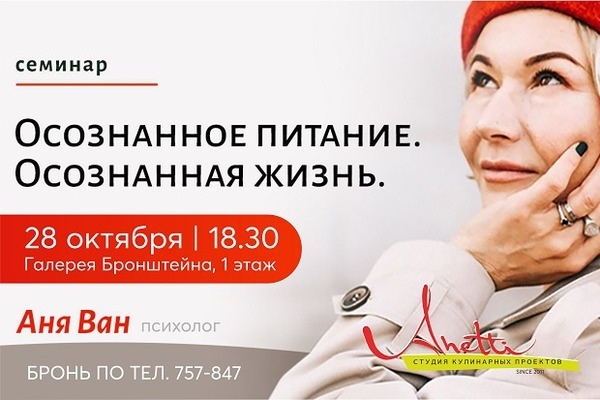 Семинар с психологом Аней Ван «Осознанное питание. Осознанная жизнь» состоится 28 октября в 18:30 в Галерее Бронштейна (Иркутск, ул. Октябрьской Революции, 3). Информация по тел. 757-847