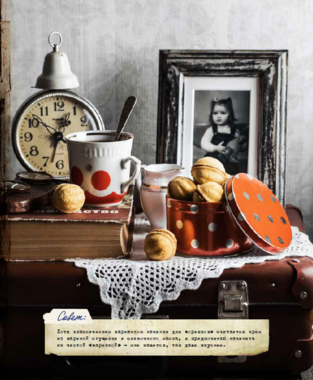 Хотя классическим вариантом начинки для «орешков» считается крем из вареной сгущенки и сливочного масла, я предпочитаю начинять их чистой «варенкой», – мне кажется, так даже вкуснее.