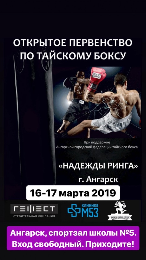 16 и 17 марта в Ангарске состоится восьмой открытый турнир по тайскому боксу «Надежды ринга». В состязании примут участие самые молодые бойцы от 6 до 14 лет. Кроме местных атлетов, на ринг выйдут ребята из Иркутска, Усолья-Сибирского, Братска и Усть-Кута. Приглашаются все желающие, вход свободный! Справки по тел: 8 (908) 666-07-53. Начало соревнований 16 марта в 13:00, 17 марта в 10:00. Место проведения: 8 микрорайон, спортзал школы №5.
