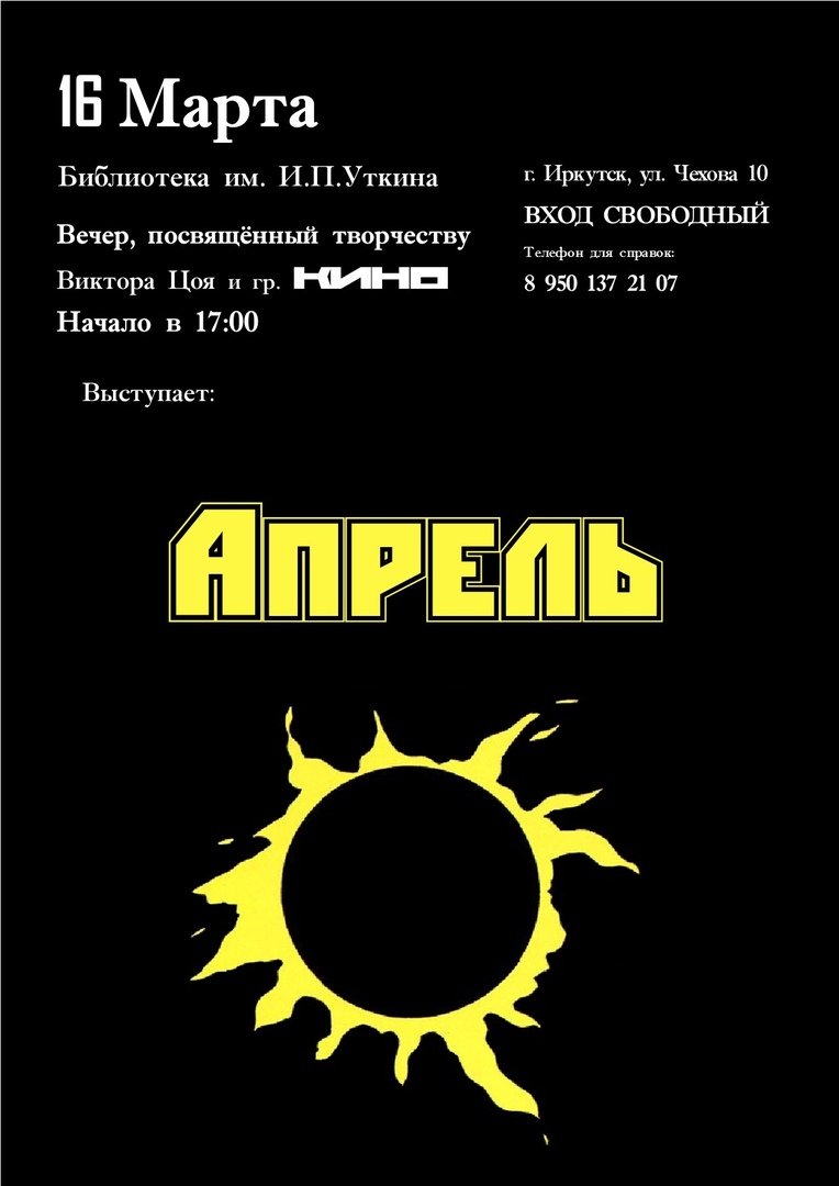 16 марта в Иркутске пройдет вечер, посвящённый творчеству Виктора Цоя и группы "КИНО". В программе: просмотр интервью Виктора Цоя 1989г., концерт группы "Апрель", общение в формате квартирника. Начало в 17:00. Вход свободный. Адрес: Библиотека им. И.П.Уткина (ул. Чехова, 10).