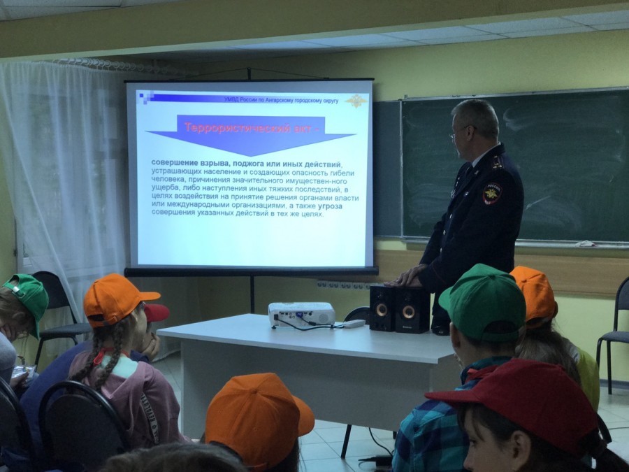 Одна из таких встреч состоялась в День защиты детей на базе областного центра «Галактика», где проходит смена для учащихся профильной 37-й школы. Заместитель начальника УМВД России по Ангарскому городскому округу Игорь Газинский представил аудитории слайдовую презентацию, где в доступной форме доведена информация об опасности терроризма. Отдыхающим в лагере на простых примерах показали правильность и безопасность поведения. В ходе беседы были затронуты исторические аспекты развития Российского общества, доведена информация о деятельности правоохранительной системы в части профилактики терроризма.