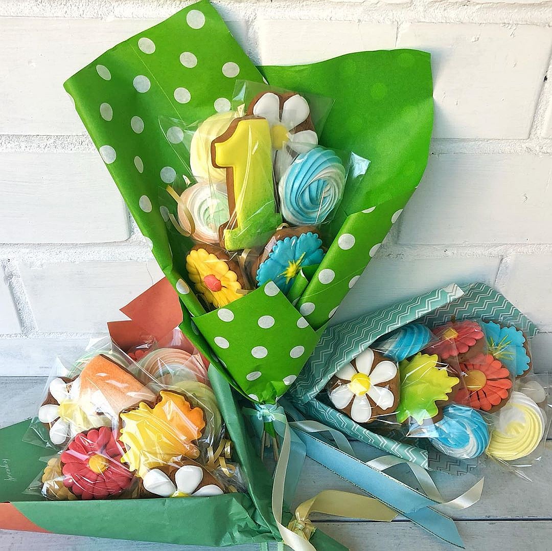 А как вам этот букет к 1 сентября? Оригинально, интересно, интеллигентно. "Пряники с сахарной глазурью - нежные, из вкусного теста с медом, сливочным маслом, щепоткой корицы и имбиря. Свежие... Воздушное безе".