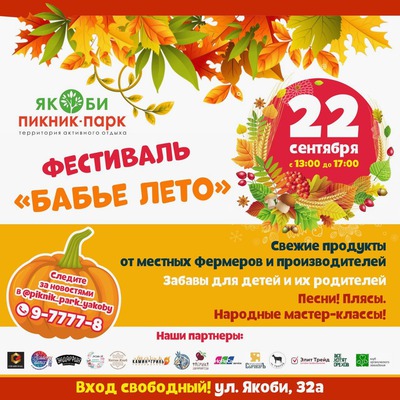 Пикник-парк «Якоби» приглашает на Фестиваль «Бабье лето» по адресу: Иркутск, ул. Якоби, 32а. Начало праздничной программы в 13:00. Гостей ждет ярмарка-продажа авторского джема, мёда, чая, масла, сыров, потрясающей выпечки и различных кондитерских изделий, сувениров и товаров для дома, дегустации и мастер-классы по заготовкам. Для детской аудитории - аквагрим, плетение из проволоки, акварельная роспись, бумагопластика, уроки по вокалу и многое другое.