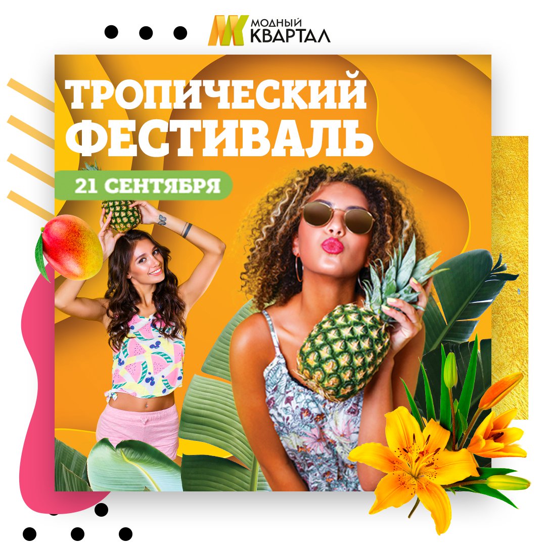 Торгово-развлекательный комплекс «Модный Квартал» приглашает всех жителей города и его гостей продлить лето вместе и очутиться в водовороте красок, музыки и неудержимого веселья. 21 сентября в торгово-развлекательном комплексе «Модный Квартал» (ул. 3 июля, 25) пройдёт экзотический «Тропический фестиваль». Начало в 15:00. В программе: зажигательный карнавал в стиле Рио-де-Жанейро, весёлое настроение и тропические фрукты, плавающие в нашем любимом фонтане. С нами лето не заканчивается!