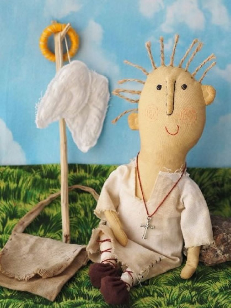 — Я посмотрела мультфильм «Василий Блаженный», — рассказывает автор куклы, мастер Елизавета Новикова из Москвы. — Хотелось что-то такое сделать в духе этого произведения. И как раз в это время я попала на «Марафон примитива», где увидела много кукол, сделанных в этой технике: неидеальное, несимметричное, нестандартное. Образ в моей голове нарисовался сам: я создала эскиз легкий, быстрый, ни разу его нигде не исправила. Стала делать куклу. Сначала сшила рубаху. Потом сделала ему крестик. Потом стала вырезать посох. Затем сшила ему котомку. И сразу придумались крылья!
