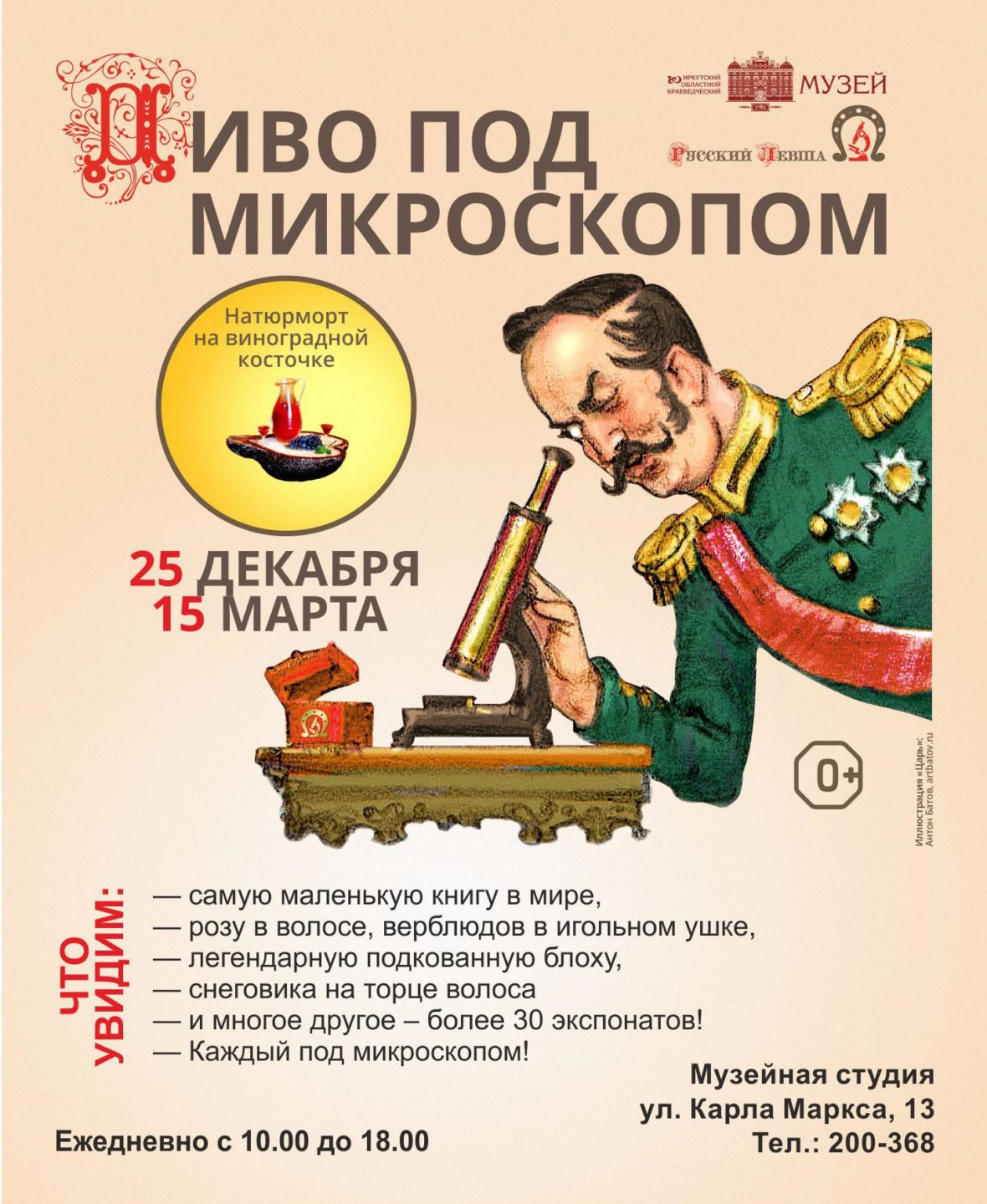 В Музейной студии Иркутского областного краеведческого музея до 15 марта работает выставка микроминиатюр «Диво под микроскопом» новосибирского мастера Владимира Анискина.На выставке представлены 39 работ мастера. Среди них такие классические работы, как «Подкованная блоха», «Верблюды в игольном ушке», «Надпись на волосе», так и оригинальные и очень сложные работы — «Роза в волосе», «Ландыши из пылинок», «Самая маленькая книга в мире» и другие. Адрес студии: ул. Карла Маркса, 13. Телефон 8(3952) 20-03-68.