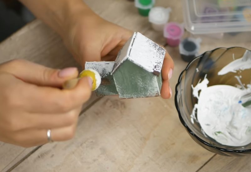 Раскрасьте домик, используя любые цвета по вашему желанию. Сделать подобие сверкающего снега на крыше можно с помощью кисточки с жесткой щетиной, небольшого количества белой краски и блесток.
