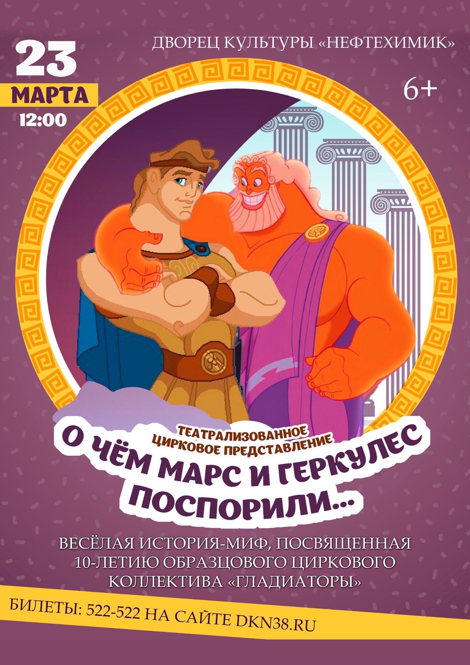 Приглашаем на театрализованное цирковое представление «О чём Марс и Геркулес поспорили…» 23 марта в 12:00 в ДК «Нефтехимик». Это веселая история-миф, посвященная десятилетию образцового циркового коллектива «Гладиаторы». Завораживающие номера в разных жанрах: акробатика, воздушные гимнасты, эквилибр и другие.