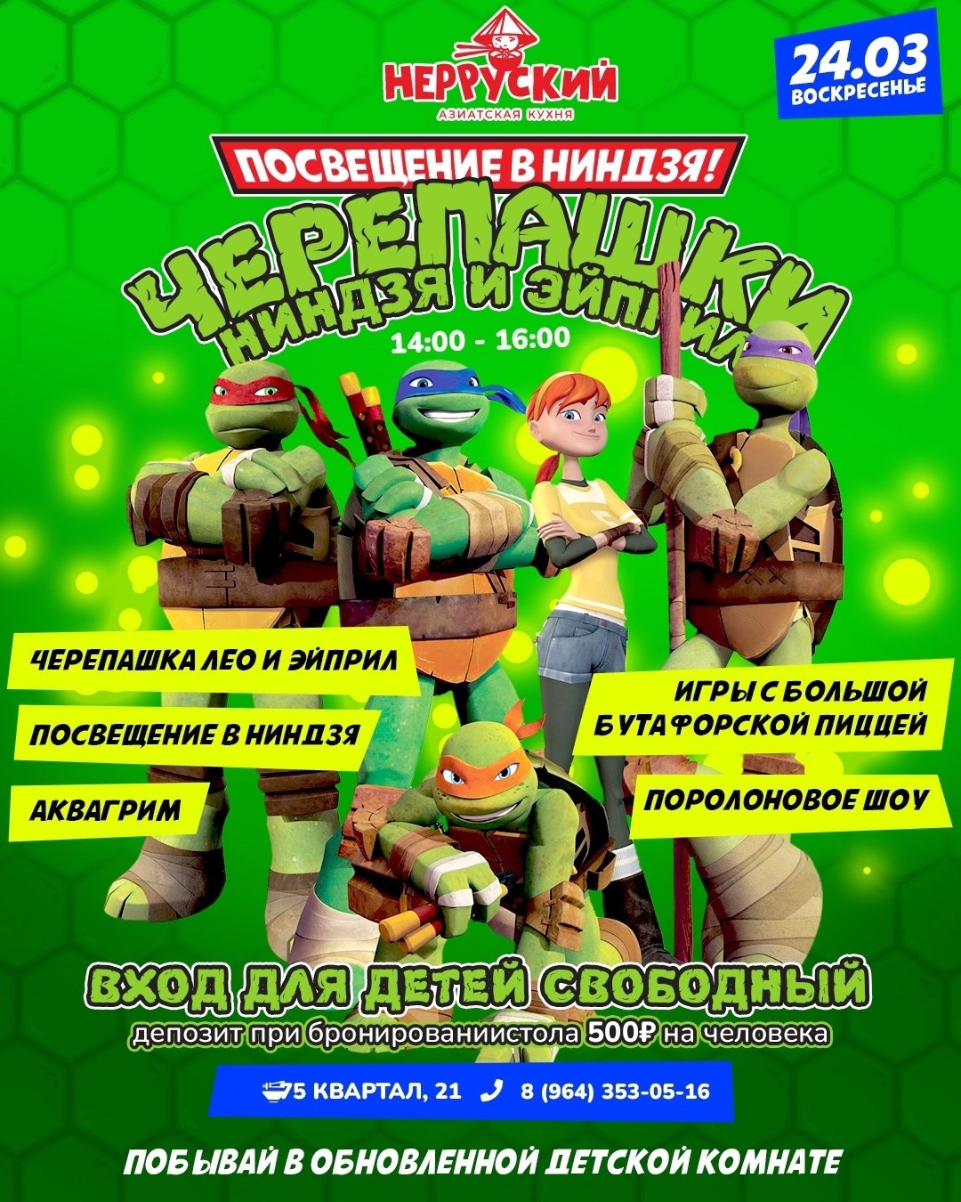 Выходные - время расслабиться, насладиться приятной атмосферой, встретиться с друзьями в ресторане «Нерруский», пока ваши ребятишки заняты. Ведь в 14:00 24 марта их будет ждать посвящение в ниндзя! Аниматоры черепашка Лео и Эйприл О' Нил, аквагрим, занимательные подвижные игры, пицца и поролоновое шоу ждут вас на вечеринке.
